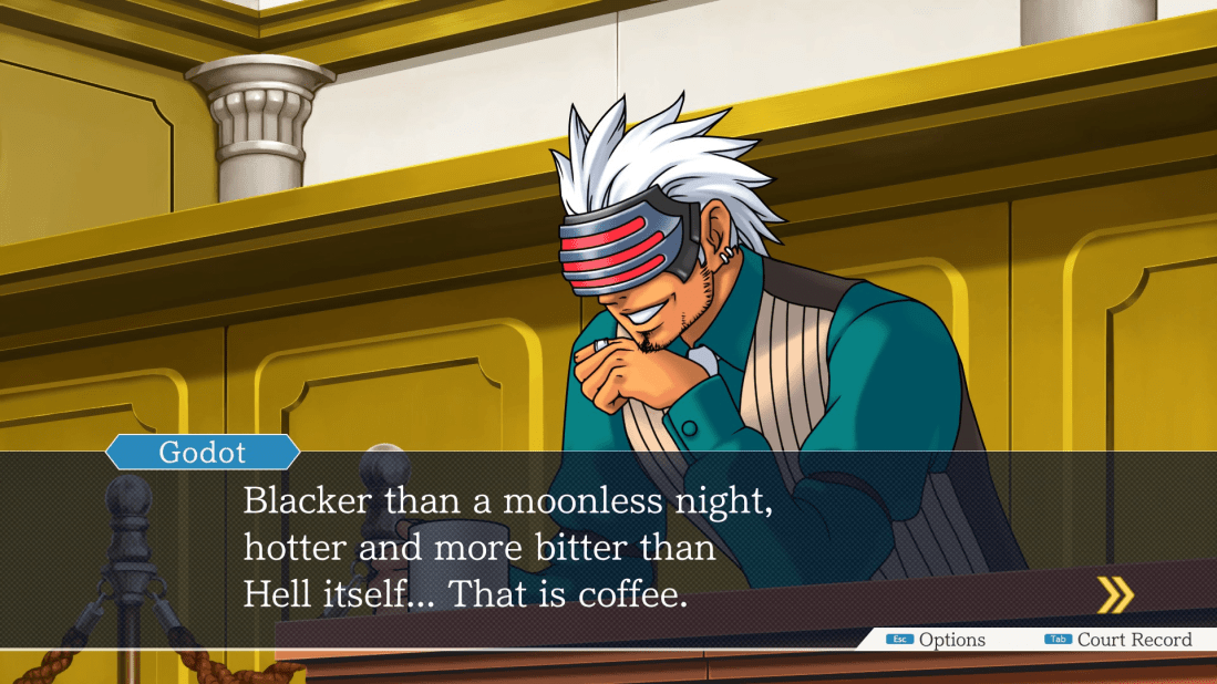 The other key antagonist (though far from a villain) is Prosecutor Godot. Each game in the franchise has a rival prosecutor, usually with their own personal connection. Prosecutor Godot starts off as a total unknown. Despite this, he despises Phoenix Wright with a fiery passion. His appearance adds to the mystery, with him wearing a robotic mask with three red lights which covers the top half of his face. Who is this coffee-chugging jerk, and how does this all connect?
